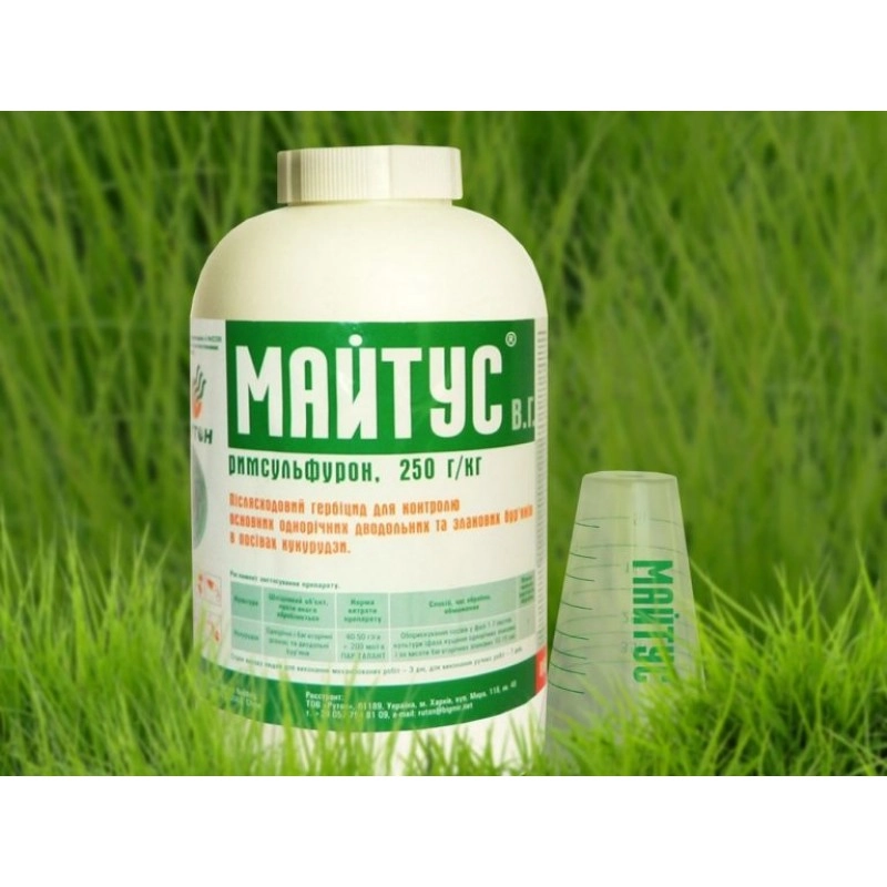 Гербицид Майтус контролирует однолетние двудольные (горчица, лобода, щирица, дурман, осот) и злаковые (пырей, мышей, просо, овсюг, тимофеевка). Действующее вещество: римсульфурон 250 г/кг. Производитель: «Нертус» (Венгрия). Визуальные признаки действия Майтуса заметны на 3-5 день после обработки. Не рекомендуется применять данный гербицид в посевах сахарной кукурузы и участках гибридизации. Майтус используют для защиты от однолетних двудольных и большенства злаковых сорняков (дикий латук, однолетняя перелеска, широкая лутига, цепкий подмаренник, татарская гречиха, кровяная пальчатка).